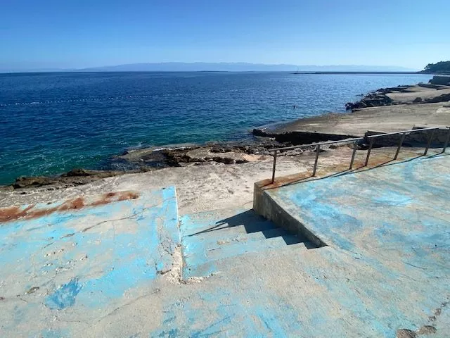 An dieser Leiter bin ich vor nun schon zwei Wochen jeden Tag mehrfach ins Meer eingetaucht. Je nachdem wann mir danach war und wie lange. Mit oder ohne Schnorchel und Flossen. Mal wollte ich einfach das Gesicht in die Sonne halten und mich tragen lassen. Das Getragensein spüren. Dann wieder wollte ich das Abtauchen üben und das leise knistern unter Wasser hören und die Sonnenstrahlen sich brechen sehen und die vielen kleinen bunten Fische betrachten, die schon vor mir im Wasser da waren.
